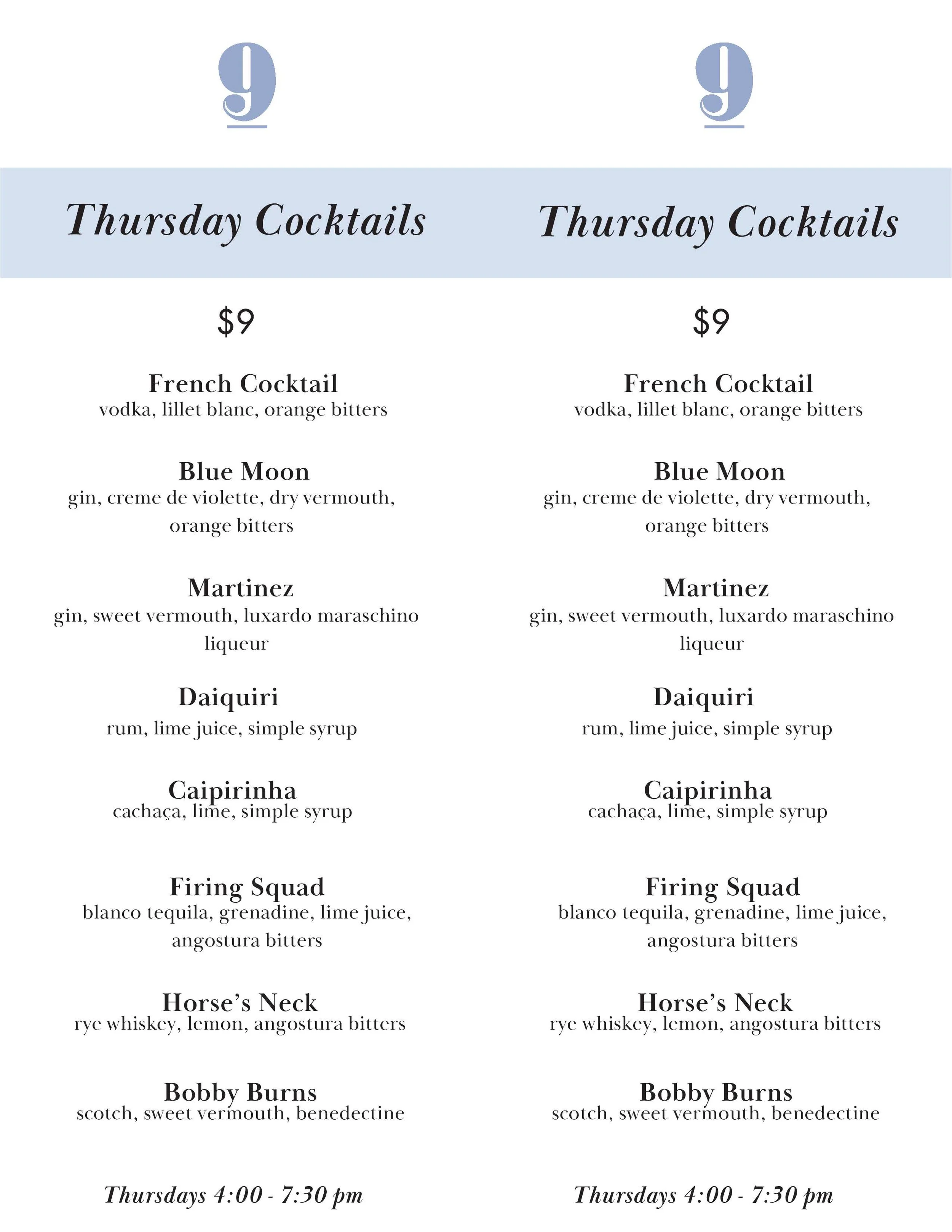 On Thursdays, enjoy $9 specialty cocktails from open to close.